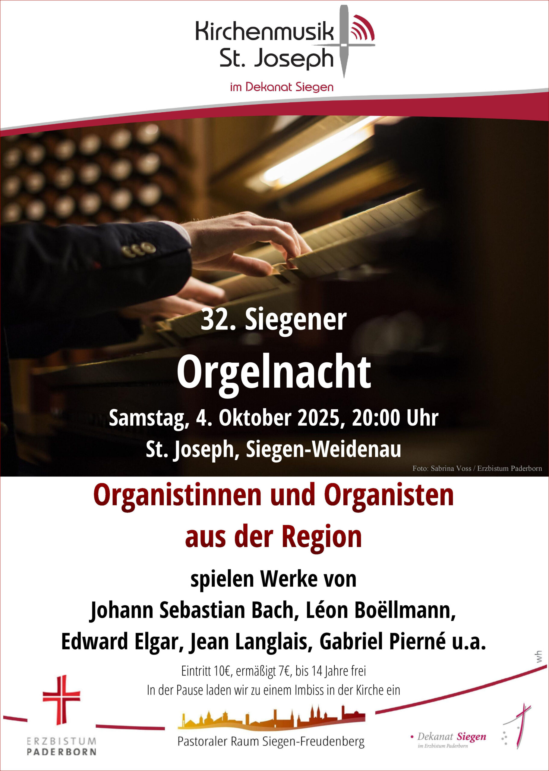Die diesjährige 32. Siegener Orgelnacht findet turnusgemäß in St. Joseph statt. Da Frau Lange die Malteser bis zum 3. Oktober als Organistin auf ihrer Romreise begleiten darf, ist die Orgelnacht auf Samstag, den 4. Oktober ab 20 Uhr verlegt worden und findet nicht, wie traditionsgemäß üblich, am Vorabend zum Tag der Deutschen Einheit statt. Es spielen wieder Organistinnen und Organisten aus der Region: Bianca Behle (Netphen), Helga Maria Lange (Siegen), Thomas Maiworm (Siegen), Christoph Niggemeier (Lennestadt), Jürgen Poggel (Heinsberg), Peter Scholl (Siegen) und Jens Schreiber (Hilchenbach) interpretieren Werke von u.a. Johann Sebastian Bach, Léon Boëllmann, Edward Elgar, Jean Langlais und Gabriel Pierné. Der Eintritt beträgt 10 €, erm. 7 €. In der Pause gegen 21:30 Uhr wird wieder zum Buffet in das Pfarrheim St. Joseph eingeladen.