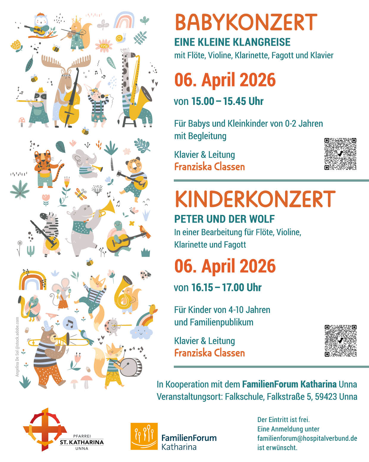 Herzliche Einladung zum Babykonzert „Eine kleine Klangreise“ am Ostermontag, 6.04 von 15.00-15.45 Uhr in das FamilienForum Katharina (Falkschule, Falkstr. 5)! Das Konzert richtet sich an Babys und Kleinkinder von 0-2 Jahren mit Begleitung, es erklingt Musik mit Flöte, Violine, Klarinette, Fagott und Klavier.