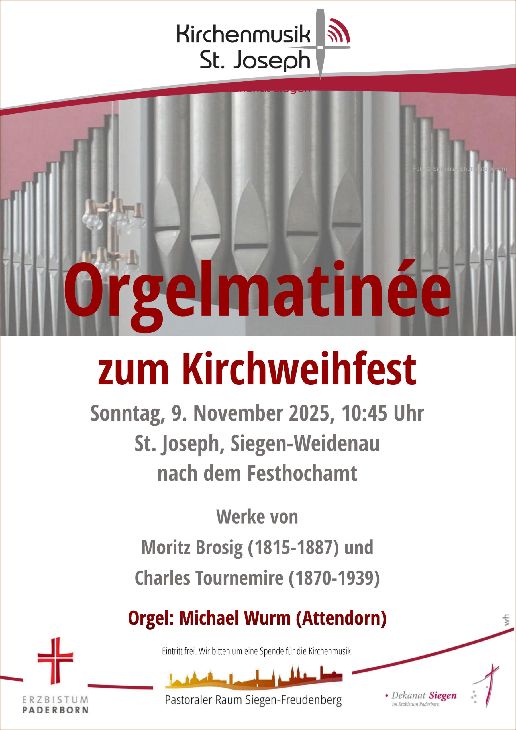 Am 9. November singt der Kammerchor Weidenau im Hochamt zum Kirchweihfest St. Joseph und dem 50-jährigen Jahrestag der Heimatprimiz von Bischof Josef Clemens. In der Messe begleitet Michael Wurm (Attendorn) an der Orgel. Im Anschluss daran ab ca. 10:45 Uhr spielt Herr Wurm eine kurze Matinée mit Werken von Moritz Brosig und Charles Tournemire. Danach können die Matinée-Besucher/innen noch an dem Empfang anlässlich des Jubiläums im Pfarrheim teilnehmen.