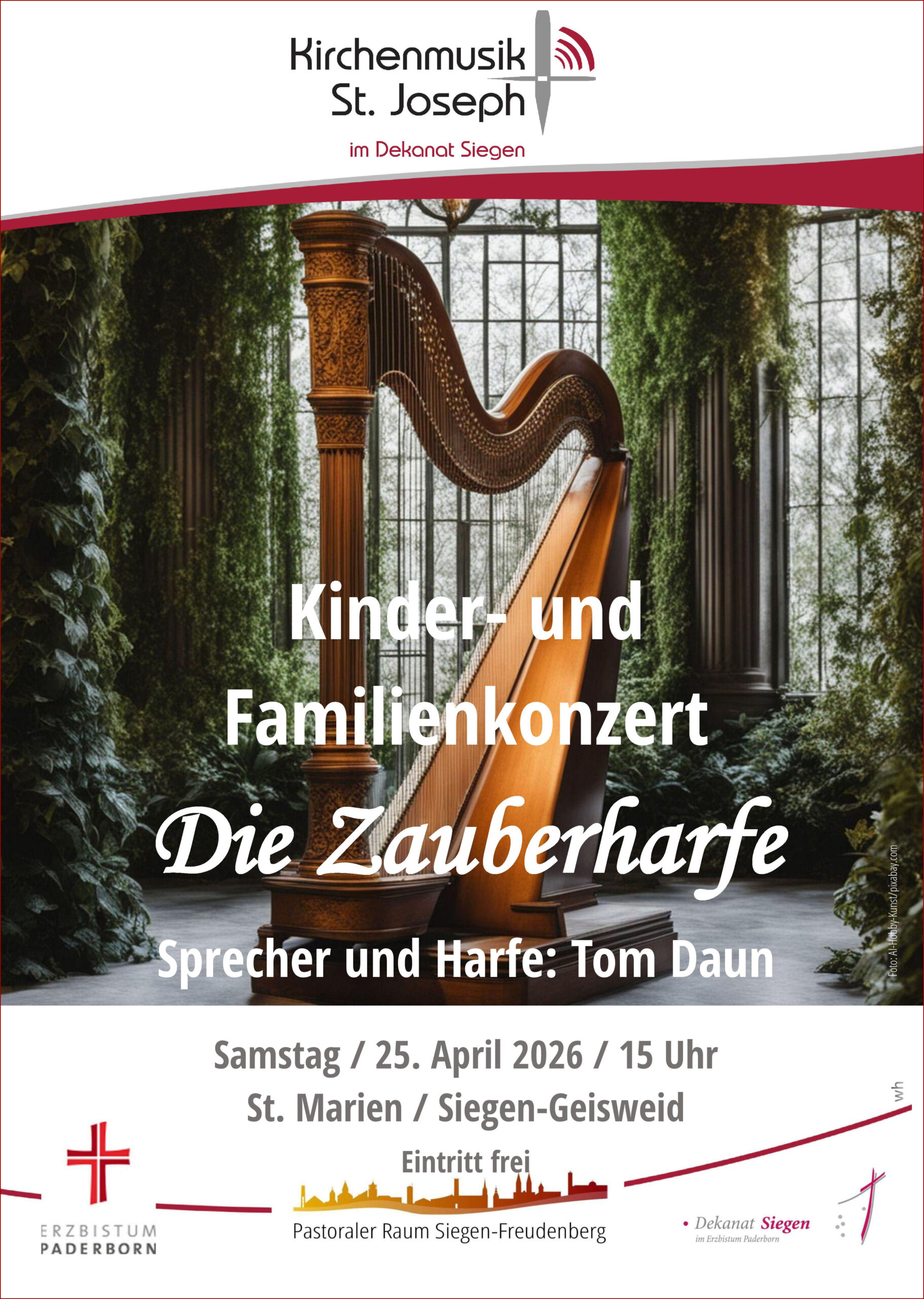 Unter dem Motto „Die Zauberharfe – Märchen, Mythen und Melodien eines Instrumentes“ führt am Samstag, 25. April um 15 Uhr in St. Marien, Geisweid der Harfenist Tom Daun in die Zauberwelt seines Instruments ein. Seit alten Zeiten berührt der Klang der Harfe die Menschen. Unzählige Mythen und Märchen ranken sich um das Instrument: rätselhafte Erzählungen aus der keltischen Tradition, ein buddhistisches Gleichnis, Legenden des Mittelalters, romantische Märchen von Prinzessinnen und Musikanten, wahre und erfundene Geschichten über die magische Wirkung des Harfenklangs. Tom Daun erzählt einige der schönsten dieser Märchen und spielt auf der Harfe. Der Eintritt zu diesem Kinder-und Familienkonzert ist frei.