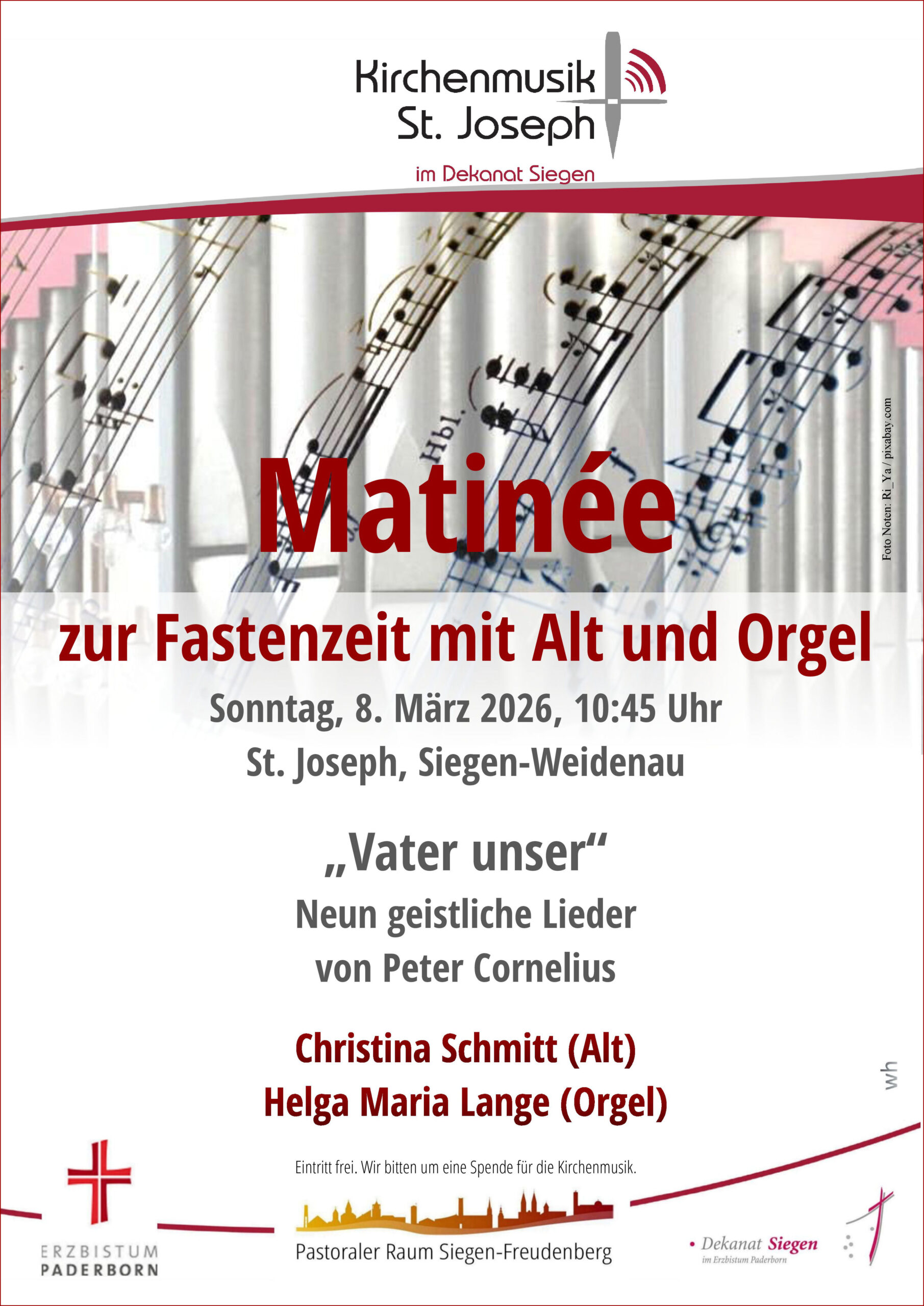 Am 8. März musiziert im Anschluss an den 9:45 Uhr-Gottesdienst in St. Joseph, Weidenauer Straße ab ca. 10:45 Uhr die im Siegerland bekannte Altistin und Chorleiterin Christina Schmitt zusammen mit DKM Helga Maria Lange. Es wird das „Vater unser“ – „Neun geistliche Lieder“ op.2 für Alt-Stimme und Orgel von dem romantischen Komponisten und Dichter Peter Cornelius (1824 – 1874) aufgeführt. In diesem Zyklus, der gut in die Fasten- und Passionszeit passt, verwendet Peter Cornelius eigene Gedichte, in denen er das „Vater unser“ in sehr persönlicher Weise paraphrasiert. Musikalisch basiert die Orgel-Begleitung auf alten liturgischen Melodien, die Cornelius in phantasievoller Gestaltung leitmotivisch verarbeitet.