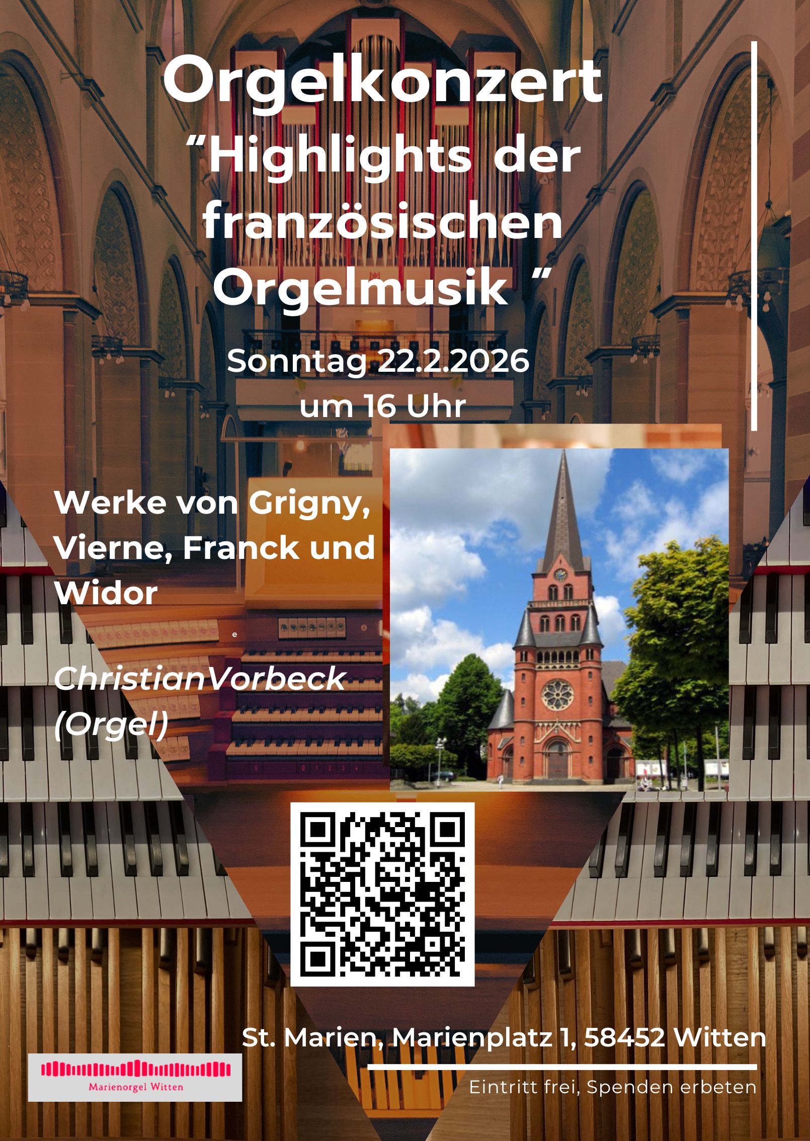 Am Sonntag, den 22. Februar 2026 findet um 16 Uhr in der Marienkirche zu Witten wieder ein besonderes Orgelkonzert statt: Unter dem Motto „Highlights der französischen Orgelmusik“ wird Kantor Christian Vorbeck an der großen Marienorgel ein abwechslungsreiches musikalisches Programm darbieten. Es erklingen Orgelwerke von Nicolas de Grigny, Louis Vierne, Cesar Franck und Charles-Marie Widor. Unter anderem kommt auch die berühmte Toccata aus Widors 5. Orgelsymphonie zur Aufführung. Dabei wird Marienkantor Christian Vorbeck am Konzertspieltisch im vorderen Kirchenschiff musizieren: So können alle Interessierte den Interpreten nicht nur hören, sondern dessen Musizieren auch aus nächster Nähe optisch mitverfolgen. Herzliche Einladung an alle, die das Orgelkonzert „Highlights der französischen Orgelmusik“ miterleben möchten! Der Eintritt ist frei, am Ausgang wird um eine Spende gebeten.