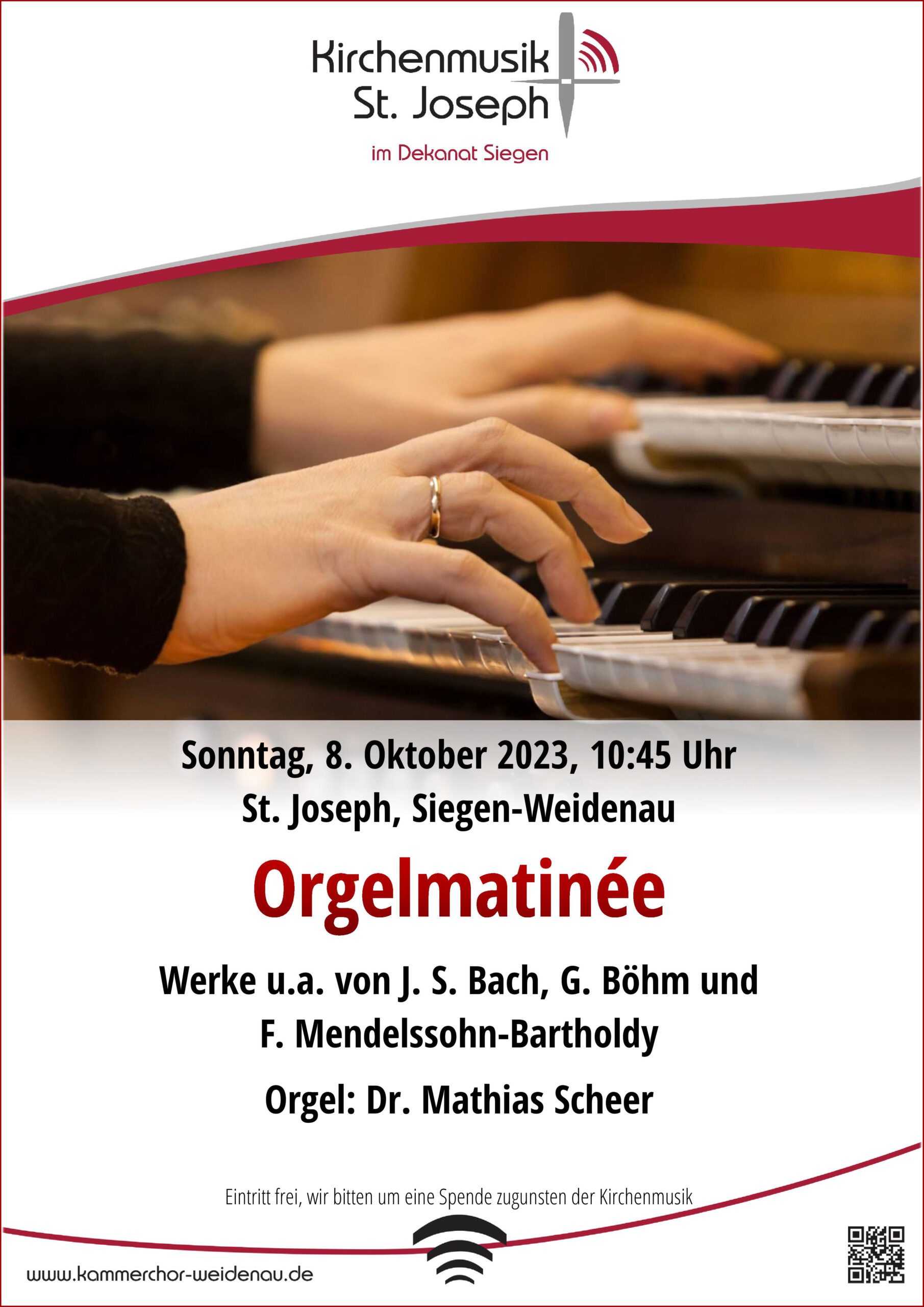 Dr. Matthias Scheer gestaltet am 8. Oktober um 10:45 Uhr die Matinée in St. Joseph mit Werken von u.a. J. S. Bach, G. Böhm und F. Mendelssohn-Bartholdy.