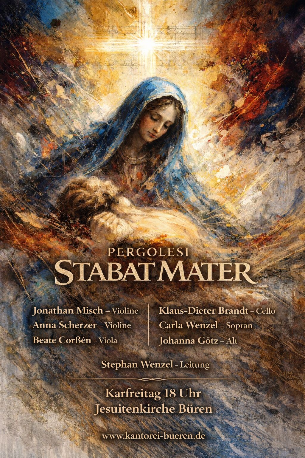 Am Abend des Karfreitag, dem 3. April 2026, wird in der ehem. Jesuitenkirche Maria Immaculata in Büren eine der berühmtesten Kompositionen des 18. Jahrhunderts aufgeführt: die Vertonung des mittelalterlichen Gedichts „Stabat mater dolorosa“ aus der Feder des italienischen Komponisten Giovanni Battista Pergolesi. Kurz vor seinem Tod entstanden, schuf Pergolesi dieses Werk für zwei Gesangsstimmen und Streichquartett, um in der Karwoche aufgeführt zu werden. Es repräsentiert beispielhaft den Übergang vom Barock zum Klassizismus.