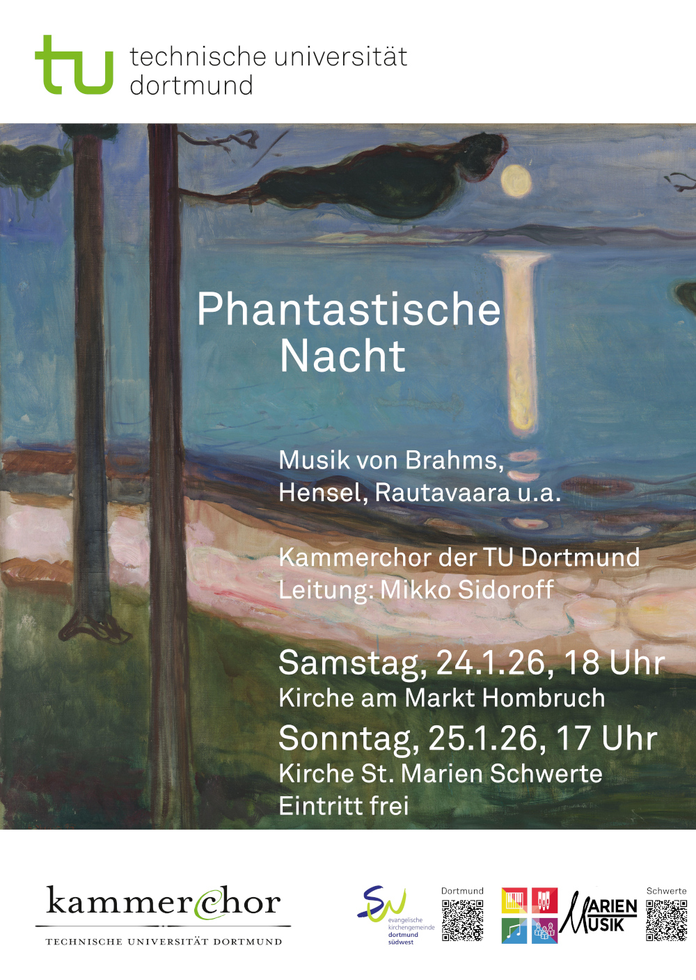 Am 25. Januar 2026 um 17 Uhr ist der Kammerchor der Technischen Universität Dortmund zu Gast in St. Marien, Schwerte. Der Chor präsentiert sich zum ersten Mal unter der neuen Leitung des finnischen Komponisten und Dirigenten Mikko Sidoroff. Es erklingt ein facettenreiches a capella-Programm, das durch Klanglandschaften des Nordens und der Romantik führt. Im Zentrum steht Sidoroffs eigenes Werk Nordisk vår, das die kraftvolle Atmosphäre eines nordischen Frühlings einfängt. Mit Werken von Rautavaara, Mäntyjärvi, Komulainen und Heiniö erklingt zeitgenössische finnische Chormusik voller Tiefe und Atmosphäre. Fanny Hensels Gartenlieder und Brahms’ Drei Gesänge schlagen den Bogen zur deutschen Romantik.