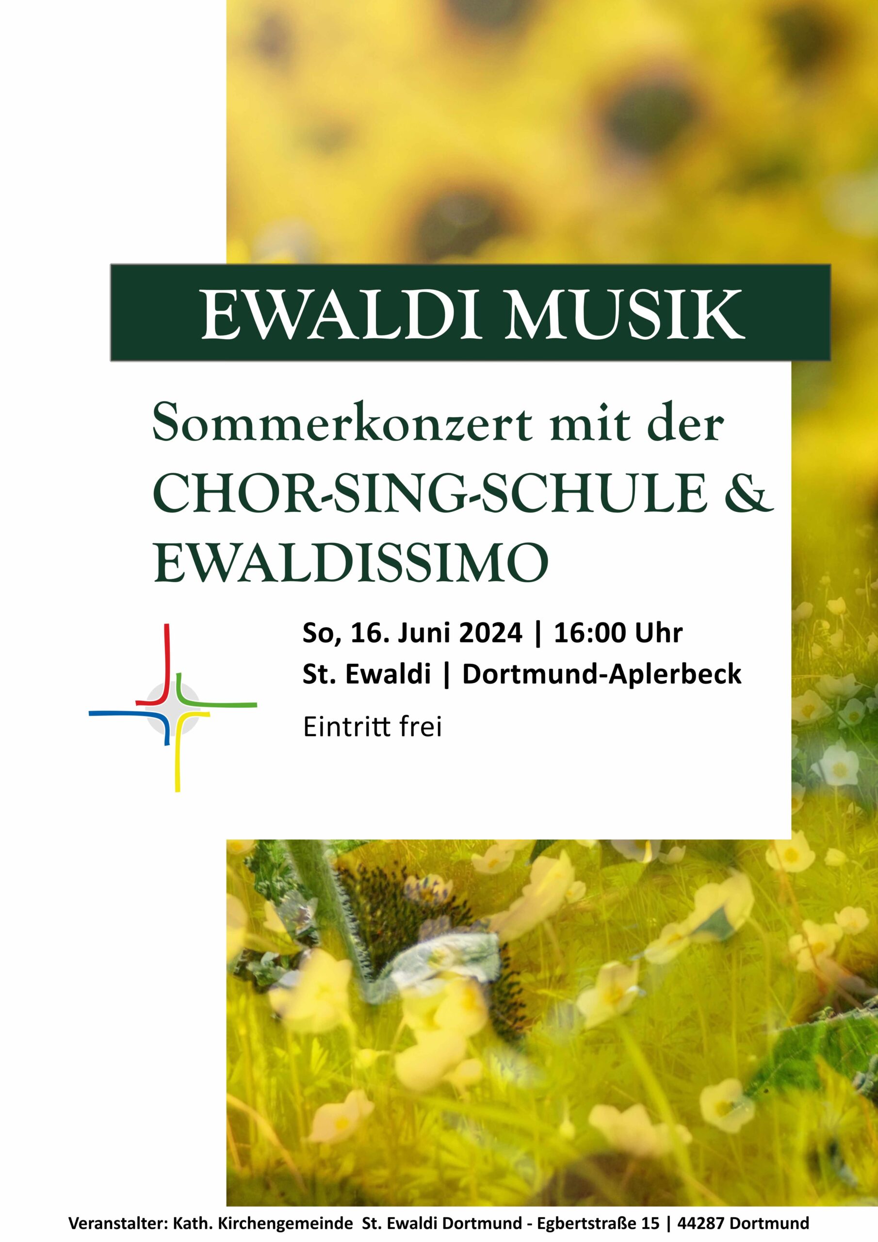 Am Sonntag, den 16. Juni 2024 wird herzlich zu einem Chorkonzert mit den Chören aus der Chor-Sing-Schule St. Ewaldi (Minis und Kinderchor) sowie Ewaldissimo unter der Leitung von Kirchenmusiker Christopher Bönninghoff in die St. Ewaldikirche in Do-Aplerbeck eingeladen. Konzertbeginn ist um 16:00 Uhr. Die Zuhörer dürfen sich auf ein buntes Programm zwischen weltlicher und geistlicher Musik aus unterschiedlichen Genres freuen. Der Eintritt ist frei. Am Ausgang wird um eine Spende für die Ewaldi-Musik gebeten.
