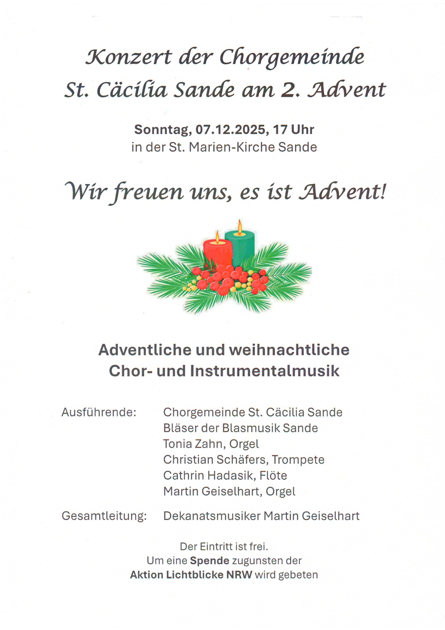 Beim traditionellen Konzert der Chorgemeinde St. Cäcilia am 2. Advent erklingen Vokal- und Instrumentalwerke u.a. von Max Reger, John Rutter, Josef Gabriel Rheinberger und Benedetto Marcello.
